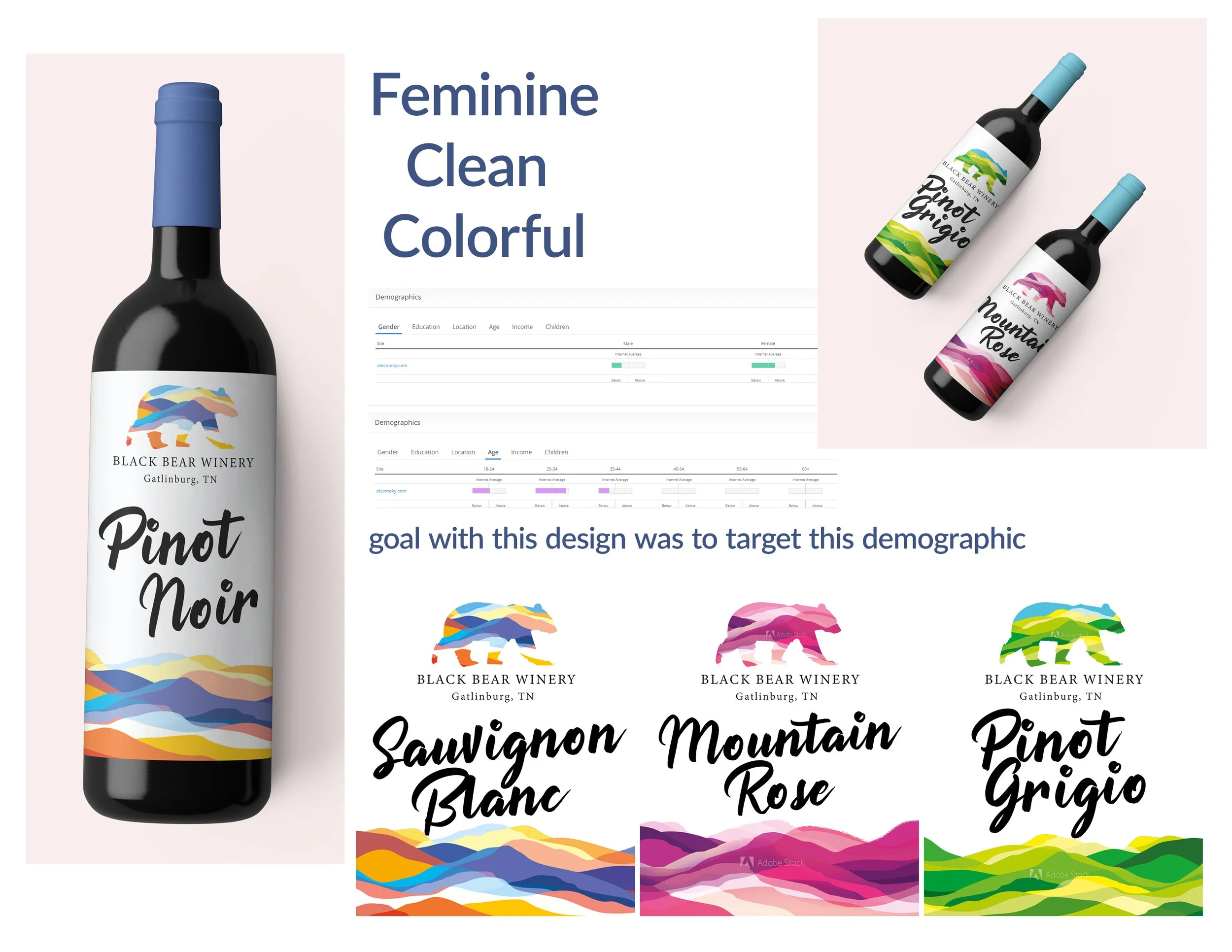 After researching the primary demographics of wine consumers in the area and analyzing the current competition, I made a proposal. I noticed that most of the alcohol industry in Gatlinburg was aimed at masculinity — even the competitive wineries — when the lead buyer of wine in the area was women. I decided the best approach would be to lean into that demographic to stand out from the crowd.